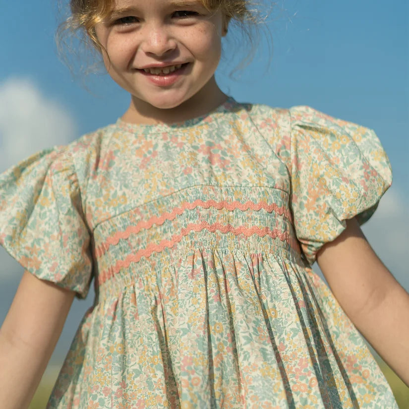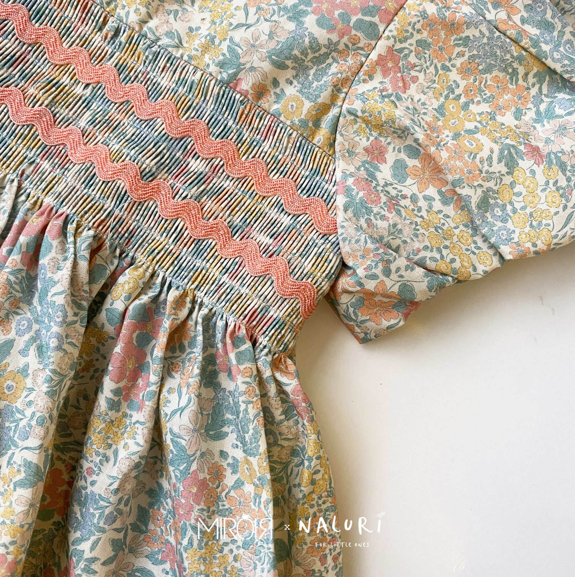 胸元のスモッキング刺繍と花柄モチーフの女の子用パフスリーブ半袖トップスです❀