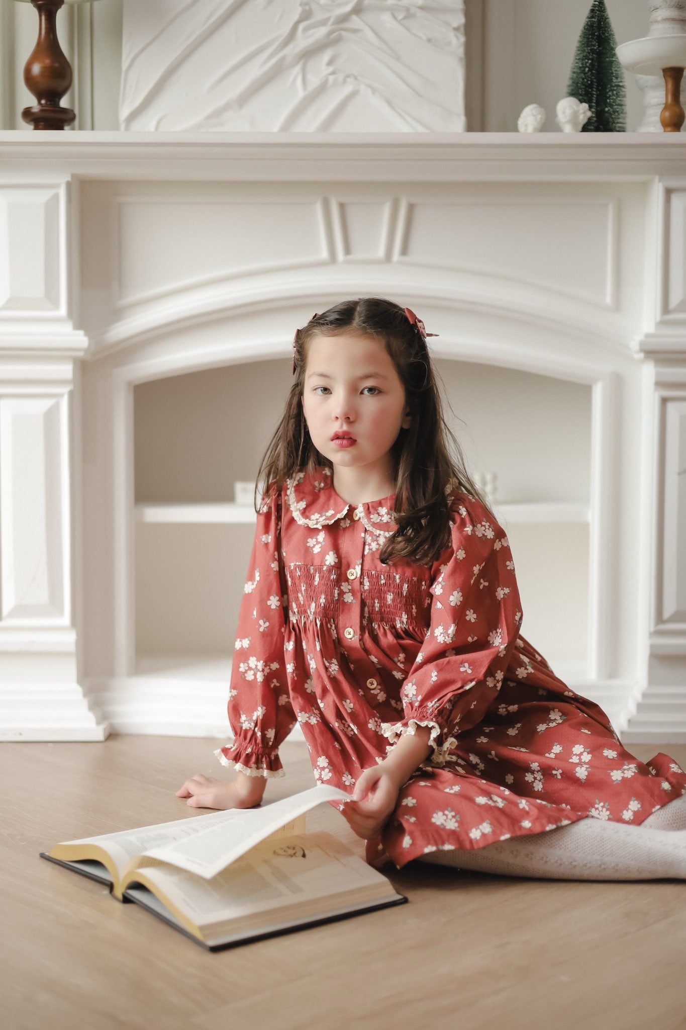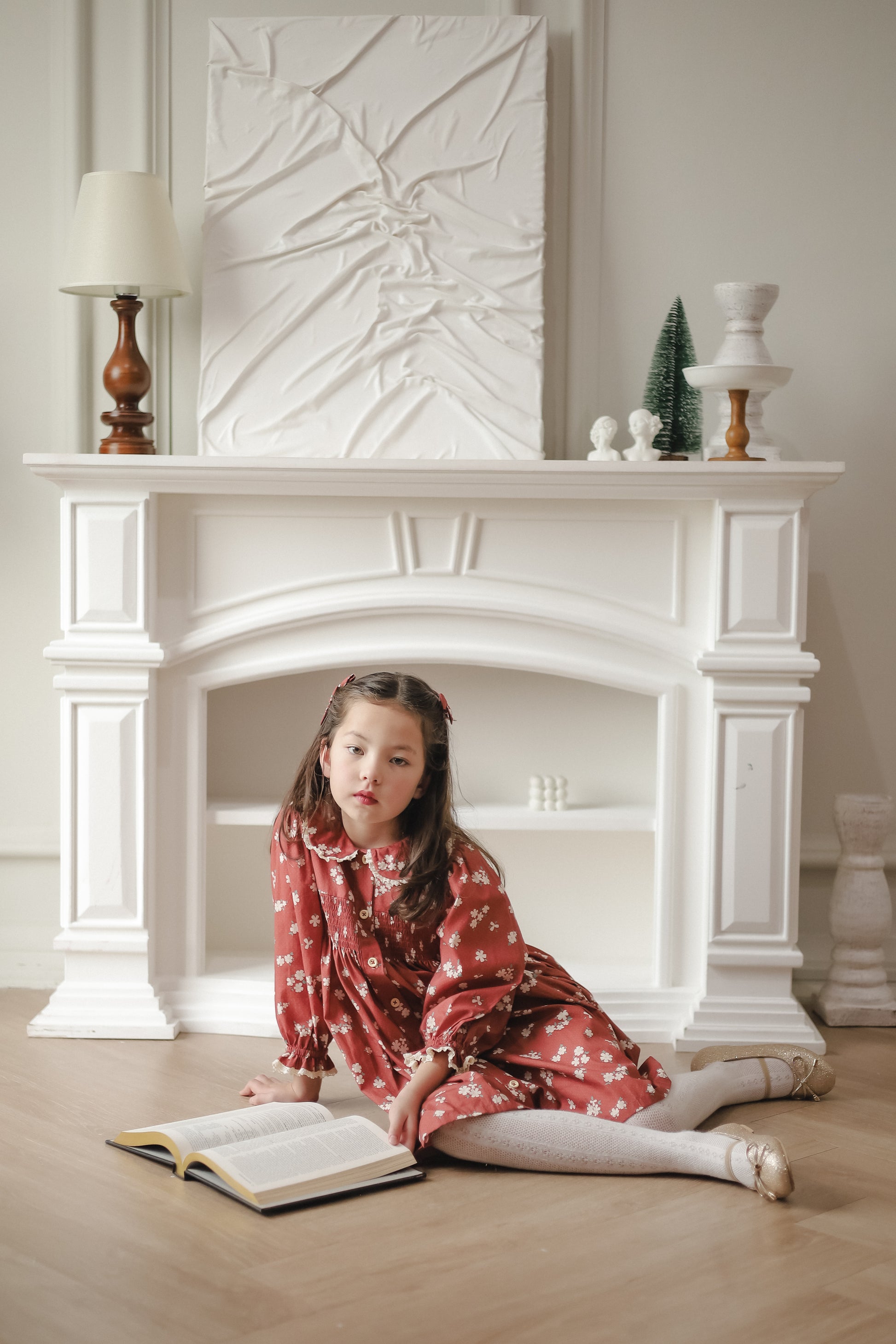 レトロな雰囲気のえんじ色の生地に白い花が散りばめられたデザインで