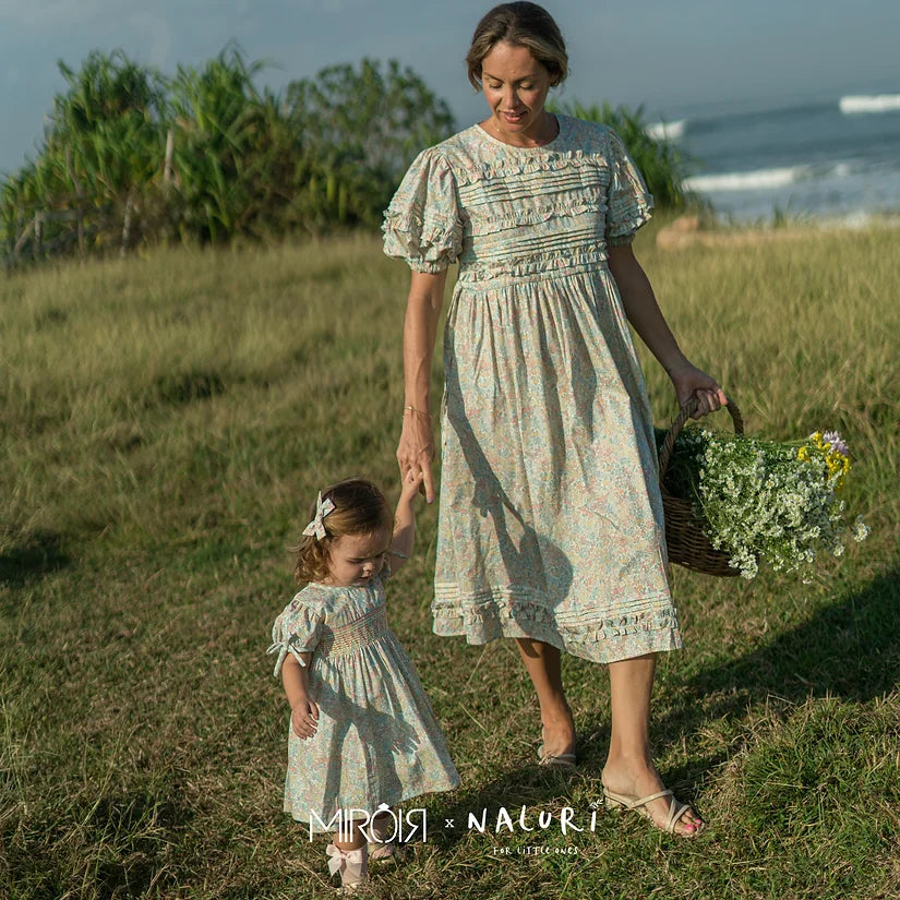 The girl's floral patterned dress with smock decoration on the chest and gingham details on the neck and sleeves is very adorable for your little one to wear. The beautiful motif was specially designed for the "Spring Garden Collection" by Naluri For Little Ones x Miroir.