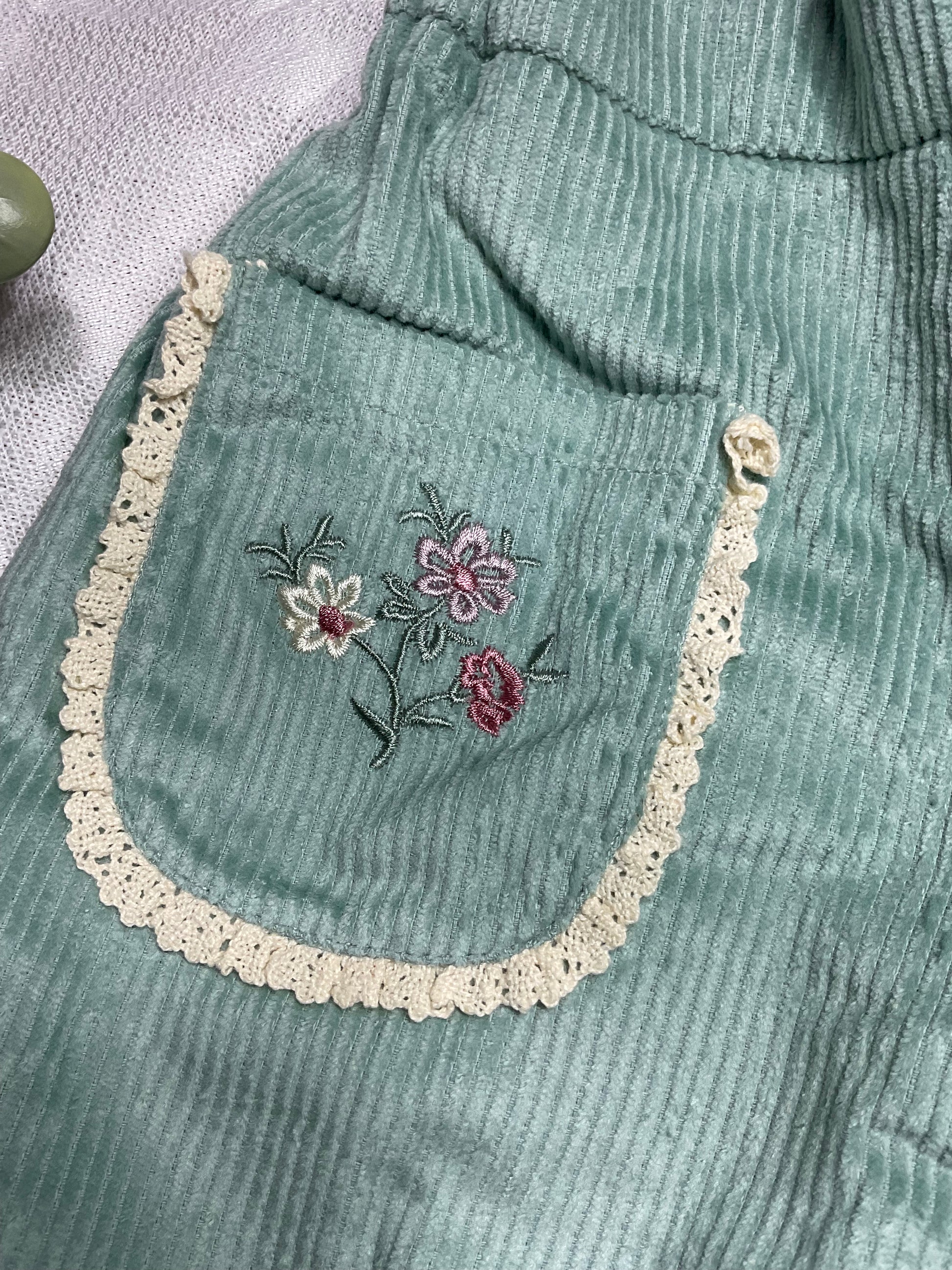 ポケットにレースの装飾と丁寧に編み込まれたお花の刺繡が美しい